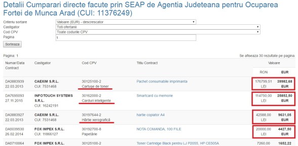 Oare procurorii nu au acces la achizițiile făcute de cei de la Agenția Județeană pentru Ocuparea Forței de Muncă Arad, sau cineva crede că s-au folosit tonere de 40 de mii de euro într-un an, sau hârtie de copiator de aproape 10 mii de euro în acelaș an, când în anul anterior și în anul următor, pentru tonere și hârtie pentru copiator, s-a plătit mult mai puțin