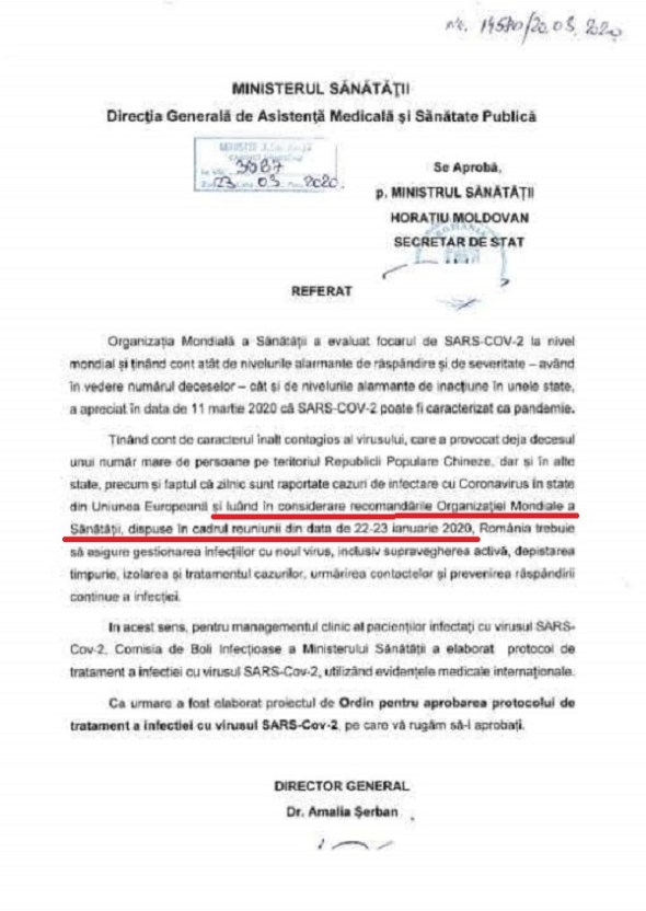 Dintr-un referat emis de Direcția Generală de Asistență și Sănătate Publică din cadrul Ministerului Sănătății, din Guvernul PNL, reiese clar faptul că la nivelul Guvernului PNL se știa încă din perioada 22-23 Ianuarie 2020 că Organizația Mondială a Sănătății a recomandat luarea de măsuri în ceea ce privește COVID-19, de ce Guvernul PNL nu a început încă de atunci aprovizionarea spitalelor cu dezinfectant și echipamente ? De ce ei să nu răspundă penal pentru zădărnicirea combaterii unei boli ?