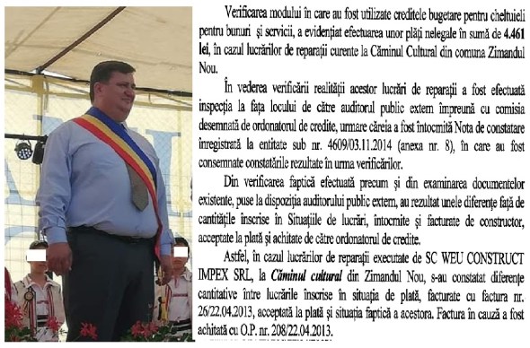 Furt din bani publici: Un raport al Curții de Conturi din anul 2014 ne arată că primarul din Zimandul Nou, Vidran Dorel, a făcut, încălcând legea, plăți pentru lucrări neexecutate