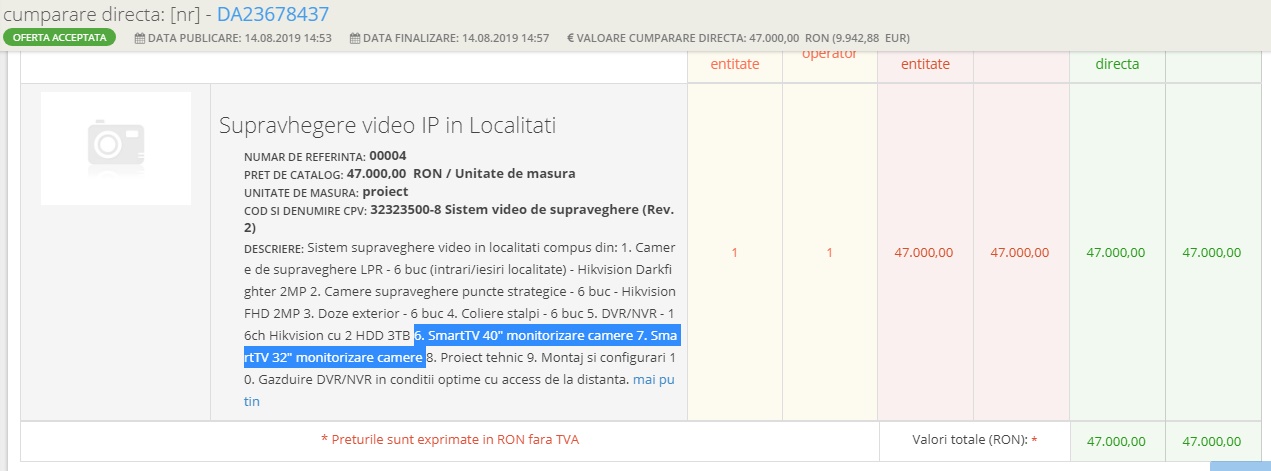 În data de 14.08.2019 la ora 14:53 Bimbo lansează o ofertă publică de achiziție a unui sistem de supraveghere video, în doar două minute, firma S.C. Vort3x Services SRL din Arad, accesează oferta, o firmă cu un singur angajat care probabil nu face nimic toată ziua, ci doar stă la calculator să prindă oferte, în alte două minute Bimbo acceptă și închide afacerea în valoare de 47 000 lei, doar ei știu cum s-au sincronizat aproape perfect, pentru un tun de 10 000 de euro