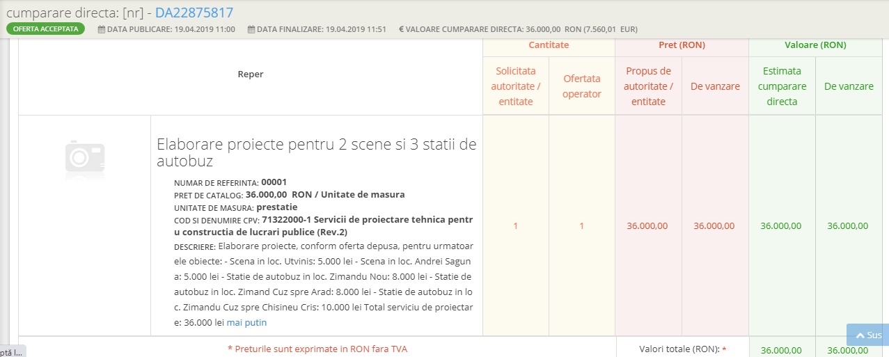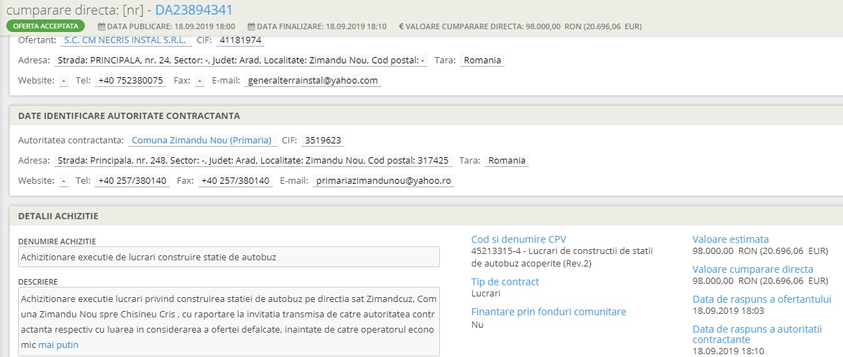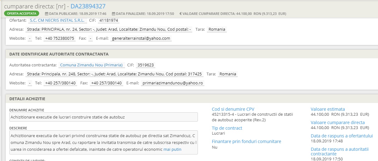 mai exact, în data de 18.09.2019 la ora 17:46 Dorel Vidran postează o ofertă de „achiziționare execuție lucrări construire stație de autobuz” în Zimand Cuz pe sensul de mers spre Arad la prețul de aproape 10 mii de euro, în următoarele 2 minute, Nechifor Cristian accesează oferta, după alte 2 minute, Dorel Vidran finalizează afacerea, s-au dus 10 mii de euro din banii publici