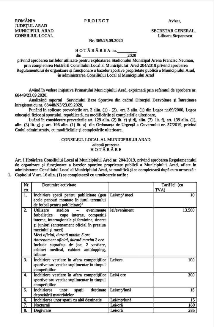 pentru a sabota și mai mult clubul recent promovat în prima ligă, unde cheltuielile sunt destul de mari, administrația PNL Arad, în ultimele zile în care mai controlează autoritar Consiliul Local Municipal Arad, a propus, și probabil prin slugile pe care le controlează în CLM Arad se va și vota, o hotărâre de consiliu prin care administrația PNL Arad să perceapă o chirie de aproximativ 400 000 de euro pe an pentru stadionul primit gratuit de la familia Neuman, clubului fondat tot de familia Neuman, doar pentru a pedepsi arădenii