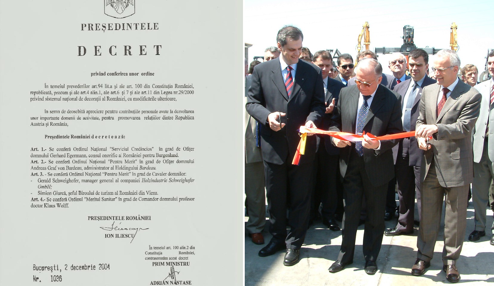 În anul anul 2004 Ion Iliescu, părintele PSD și groparul democrației în România, îl decora pe șeful de la Holzindustrie Schweighofer pentru afacerile pe care le făcea corporația în România, încurajându-i în acest fel să exploateze și mai mult pădurile din România, această încurajare a fost „fundația” pe care s-a consolidat mafia pădurilor, mafie care și în prezent defrișează ilegal pădurile din România. Mulțumim PSD, dar și PNL-ului pentru că v-ați alăturat mafiei pădurilor și nu ați făcut nimic real pentru împiedicarea jefuirii pădurilor, și aceste este unul din motivele pentru care nu mai meritați să fiți votați