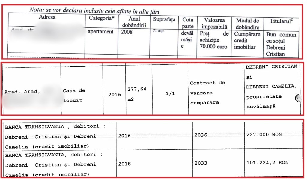 Amândoi fiind judecători, conform legii, declarațiile lor de avere ar trebui să conțină date identice despre bunuri, datorii, venituri … etc., nici măcar nu s-au sinchisit să vorbească între ei și să treacă același lucruri, nimeni nu îi trage la răspundere pentru fals în declarații, … în 2008 cumpără într-o zonă centrală din Arad un apartament de 71 mp cu 70 de mii de euro cu credit ipotecar, în anul 2011 ei declară că datorează băncii tot 70 de mii de euro, de parcă nu ar fi plătit nici o rată, … în 2016 cumpără tot în Arad, într-o zonă liniștită o vilă de 277 mp pe un teren de 987 mp cu doar 227 mii lei, aproximativ 50 de mii de euro, … în anul 2018 mai iau un credit ipotecar dar nu declară nici un imobil, oricum nimeni nu le face nimic orice ar declara … conform legii, falsul în declarații se pedepsește, dar acest lucru nu se aplică judecătorilor, de ei nu se atinge nimeni și nici nu le verifică nimeni sursele de venituri …