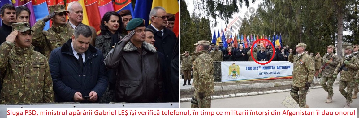 Ministrul apărării, Gabriel Leș, îți butona telefonul când militarii români întorși din Afganistan îi dădeau onorul, aceasta este forma de respect pe care PSD o oferă românilor, civili sau militari