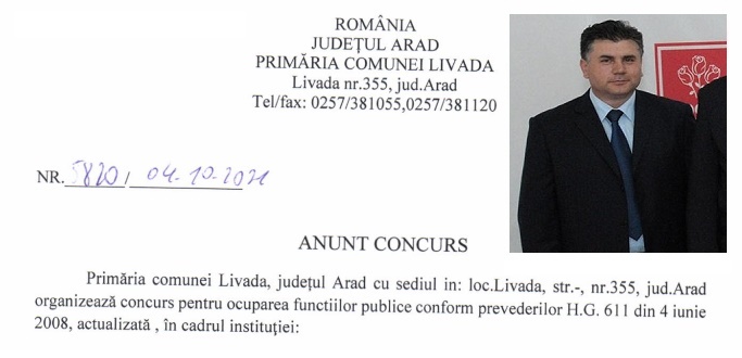 Primăria Livada scoate la concurs trei posturi în cadrul administrației locale, concurs care va avea loc în data de 22 Noiembrie 2021, nu este un secret pentru nimeni faptul că angajările în administrațiile locale sunt doar pentru membrii de partid, rudele, prietenii, amanții și amantele lor … și Primăria condusă de fostul pesedist Bimbo, transformat în mare penelist, chiar nu este o administrație care să facă excepție …