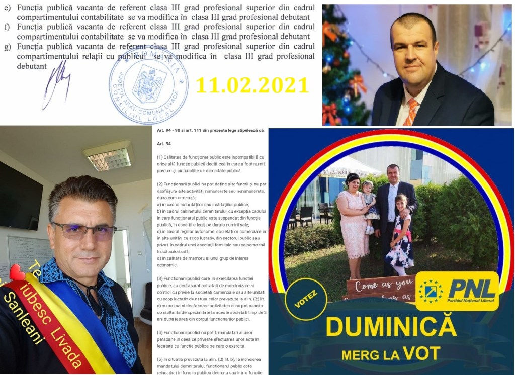 03.01.2022 – consilierul local Leahu Dorel Nicolae este angajat la Primăria Livada ca și funcționar public, 07.01.2022 – funcționarul public Leahu Dorel participă și asigură cvorum la o ședință a consiliului Local Livada în calitate de consilier, și votează, deși acest lucru este ilegal, fiind în incompatibilitate conform legii, nu are voie să dețină o funcție publică și să fie și consilier local … dar pentru ei respectarea legii nu pare obligatorie