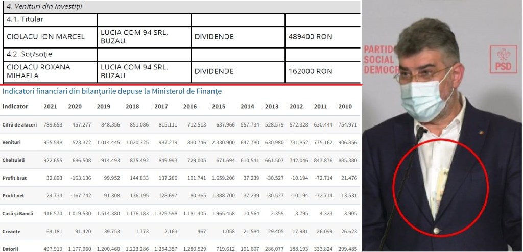 În declarația de avere depusă de Marcel Ciocacu, președintele Camerei Deputaților și președintele mascotă a celui mai mare și corupt (la braț cu PNL) partid din România, în anul 2022 pentru anul financiar 2021 declară că a scos împreună cu soția dividende din firma SC LUCIA COM 94 SRL în valoare de 651 400 lei la o cifra de afaceri (în anul 2021) de 789 635 lei și un profit net de 24 734 lei, în anul financiar 2020 chioșcul/patiseria familiei a avut o pierdere de -167 742 lei dintr-o cifra de afaceri de 457 244 lei, … practic, familia Ciolacu a scos dividende din firmă mai mult decât a avut firma profit net (461 299 lei) în ultimii șase (6) ani, acestui personaj serviciile i-au dat aviz pozitiv pentru a ocupa funcția de președinte a Camerei Deputaților iar procurorii nu văd o încălcare evidentă a legii, nu putea scoate dividende mai mari decât profitul