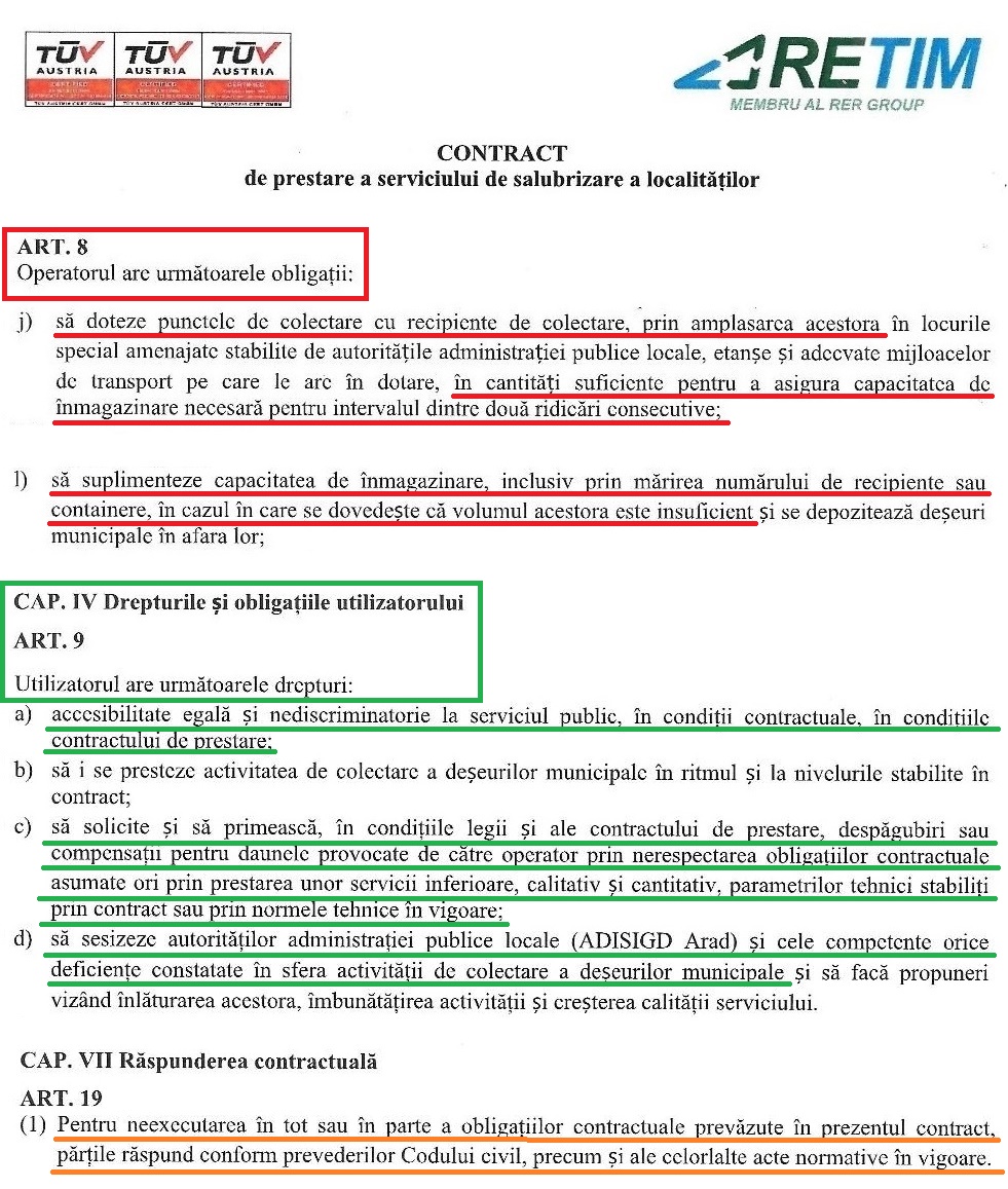 Noua firmă acreditată de administrația locală să ridice gunoiul menajer în Arad încalcă contractul pe care ne-au forțat să îl semnăm sub amenințarea amenzilor. Deși ei s-au obligat prin contract să doteze punctele de colectare cu pubele, după semnarea contractului de către cetățeni, ei invită cetățenii să meargă fiecare să își ridice pubelele, ne tratează ca pe milogi deși noi urmează să plătim un tarif mai mare decât plăteam înainte. Mai jos sunt câteva din obligațiile lor și din drepturile noastre, stabilite de ei prin contractul pe care l-au negociat, abuziv, cei de la RETIM cu administrația locală