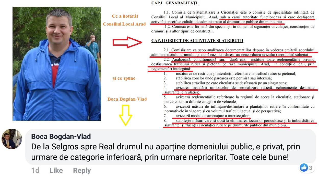 Ce spune legea privind intersecția făcută de Selgros la ieșirea din parcarea magazinului, art. 6, alin. 14 din Codul Rutier: drum public – orice cale de comunicaţie terestră, cu excepţia căilor ferate, special amenajată pentru traficul pietonal sau rutier, deschisă circulaţiei publice; drumurile care sunt închise circulaţiei publice sunt semnalizate la intrare cu inscripţii vizibile; Consiliul Local Arad a și stabilit componența și rolul Comisiei de Sistematizare a Circulației în Arad; și ce ne spune unul din intelectualii care iau decizii privind administrarea orașului …